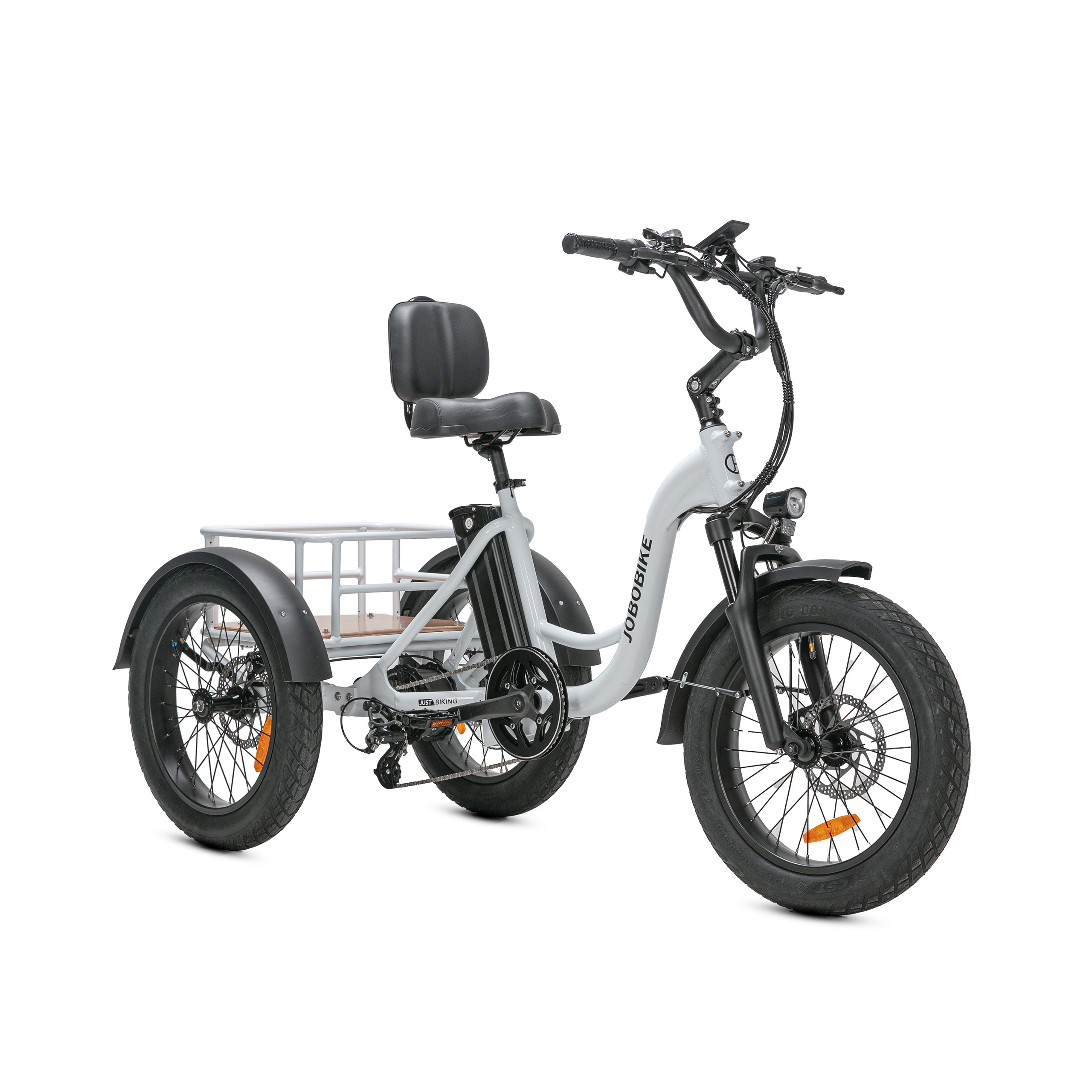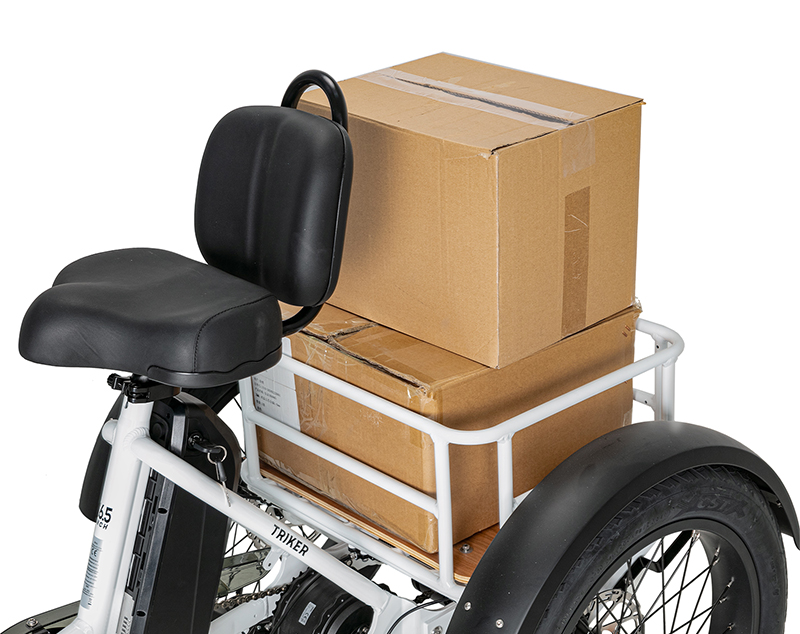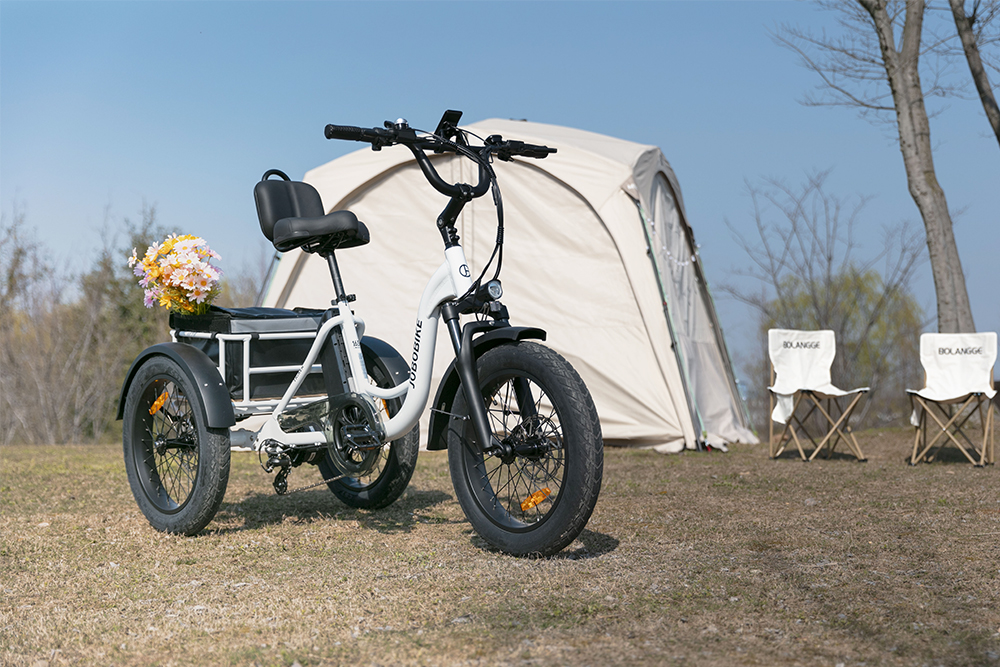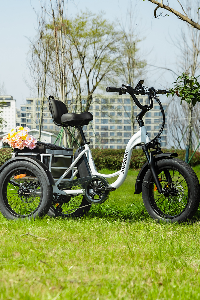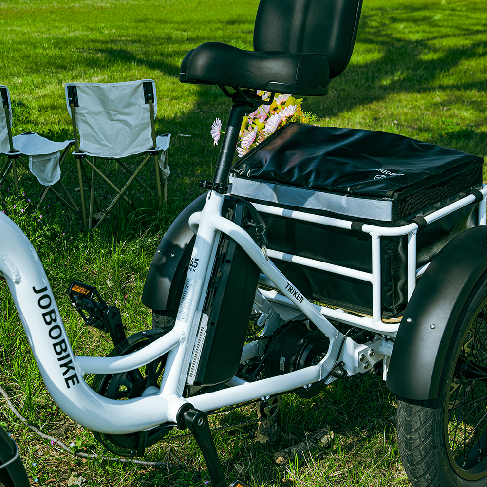 The frame is made of 6061 aluminum alloy, and the tricycle can securely carry bulky items with its reinforced design, ideal for cargo transport.
